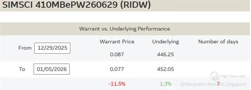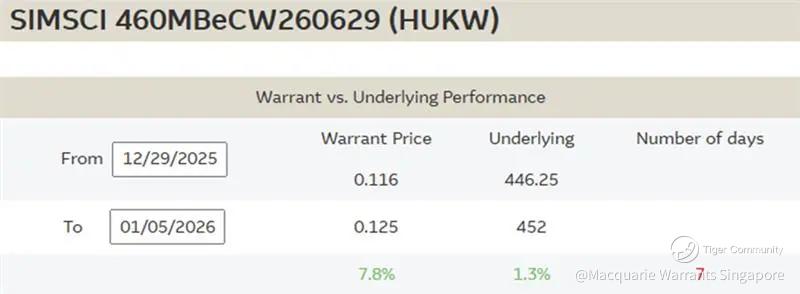 Macquarie listed new SIMSCI call and put warrants on 29 December 2025. Call warrant HUKW (https://warrants.com.sg/tools/HistoricalPerformance/HUKW) has risen 6.9% to SGD 0.124 as of 925AM this morning over the past week given SIMSCI’s 1.2% increase, while put warrant RIDW (https://warrants.com.sg/tools/HistoricalPerformance/RIDW) is down 11.5% to SGD 0.077.