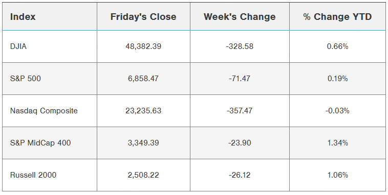U.S. stocks ended 2025 with mixed results during the holiday-shortened trading week, as most major indexes achieved double-digit annual gains for the third consecutive year. While the Nasdaq Composite, Russell 2000, and S&P 500 declined for the week, the Dow Jones and S&P MidCap 400 showed relative resilience with smaller losses of 0.67% and 0.71% respectively. Energy stocks within the S&P 500 bucked the negative trend, posting gains as geopolitical tensions pushed oil prices higher.