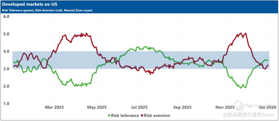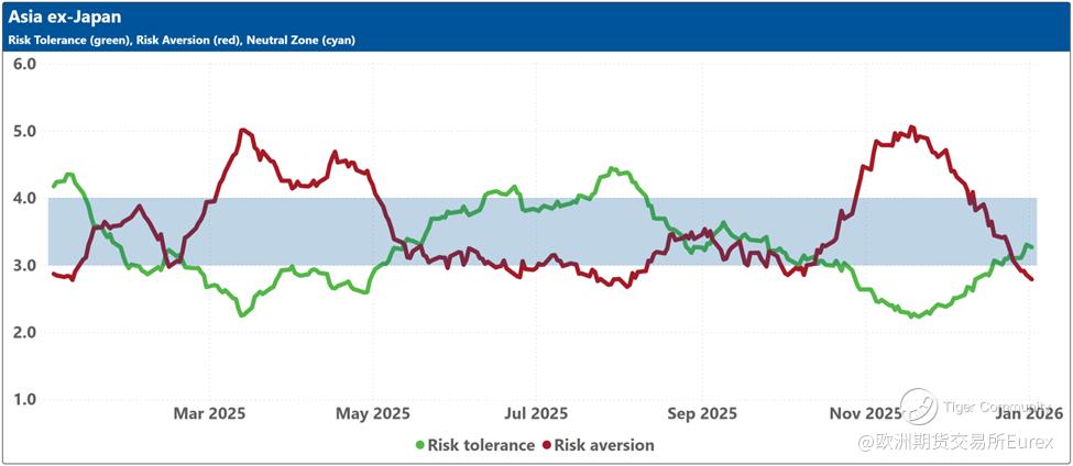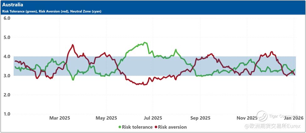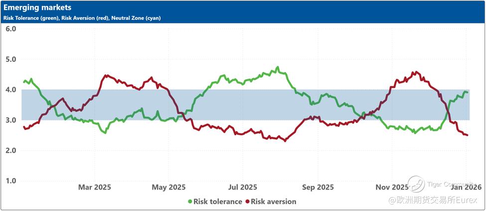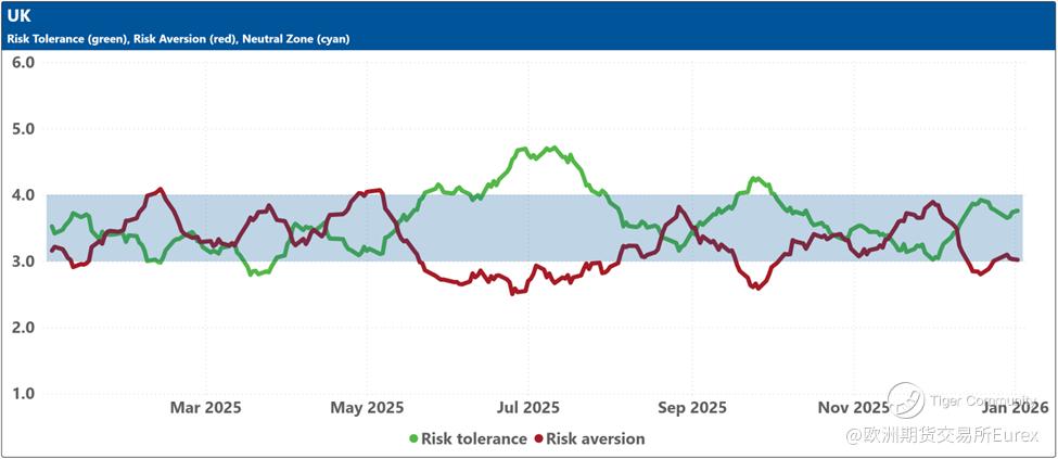 The blue shaded zone between levels 3 and 4 for both indicators signifies a reasonable balance between the supply and demand for risk in the market. When both lines remain within this blue zone, the market is considered ‘emotionally’ stable. However, when both lines move outside this zone, the significant imbalance in demand and supply for risk can lead to overreactions to unexpected news or risk events.