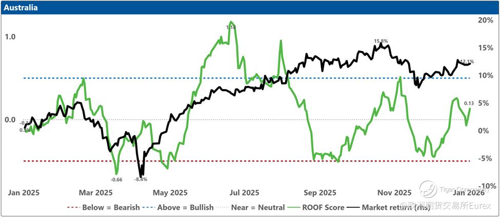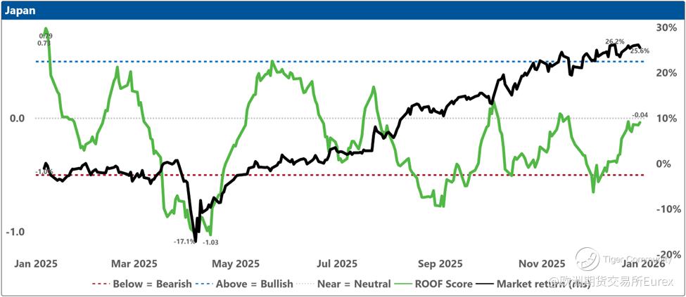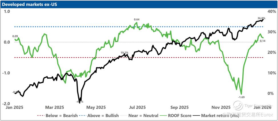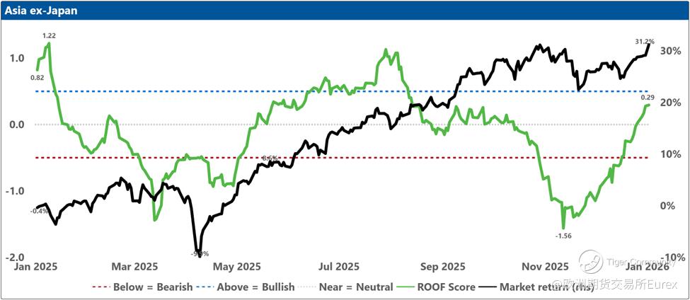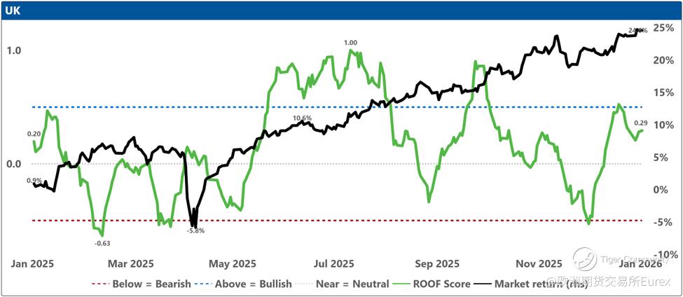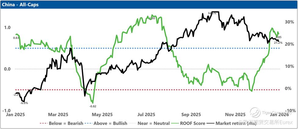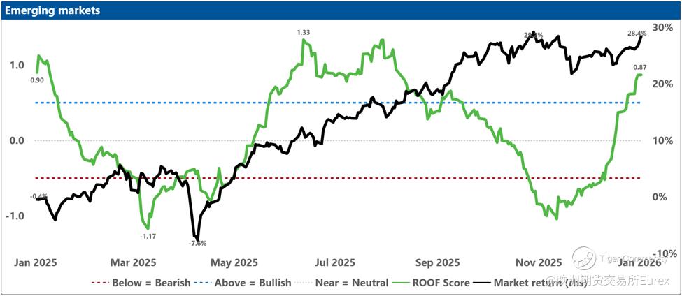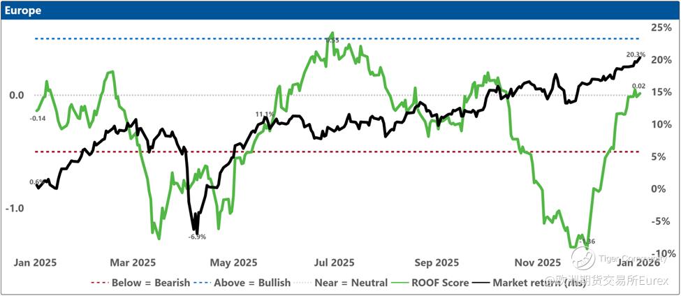 The top charts illustrate the ROOF ratio, which represents investor sentiment. This ratio is depicted in green on the left axis, while the cumulative returns of the underlying market are shown in black on the right axis. Key reference lines include: