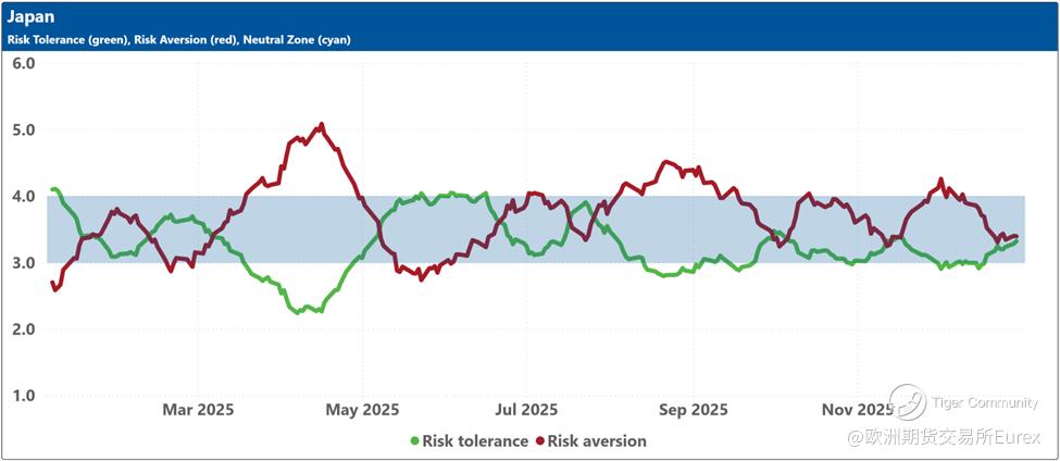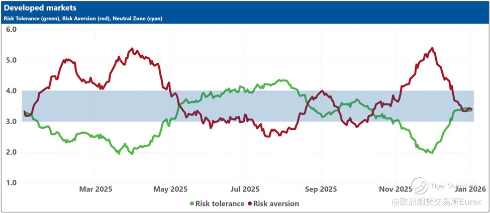 The bottom charts display the levels of risk tolerance (green line) and risk aversion (red line) within the market, representing investors' demand and supply for risk, respectively. Key insights include: