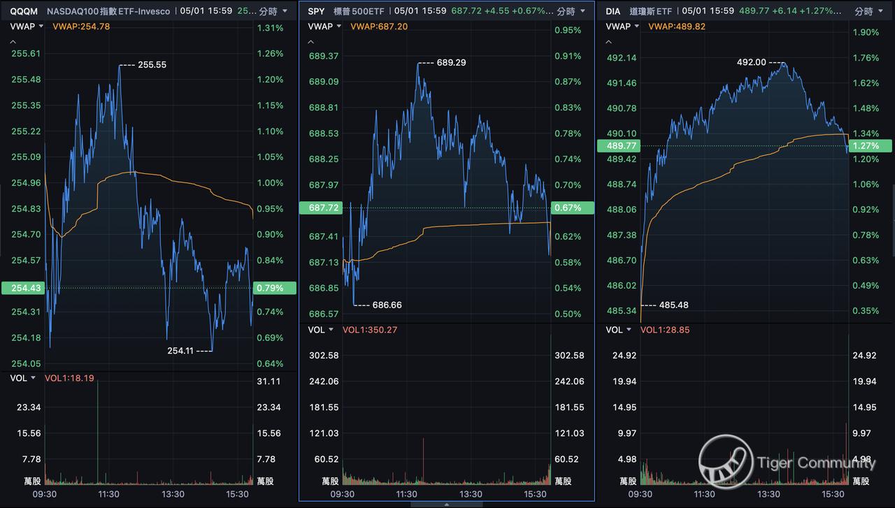 從盤面看,納斯達克100 $納斯達克100指數(NDX)$ $NASDAQ100指數ETF-Invesco(QQQM)$ (QQQM)、標普500 $標普500(.SPX)$ $標普500ETF(SPY)$ (SPY)、道瓊斯 $道瓊斯ETF(DIA)$ $道瓊斯(.DJI)$ (DIA)三大指數全部收漲,漲幅都不大,但結構極其一致——早盤衝高,盤中回落,尾盤維持在 VWAP 附近收市。