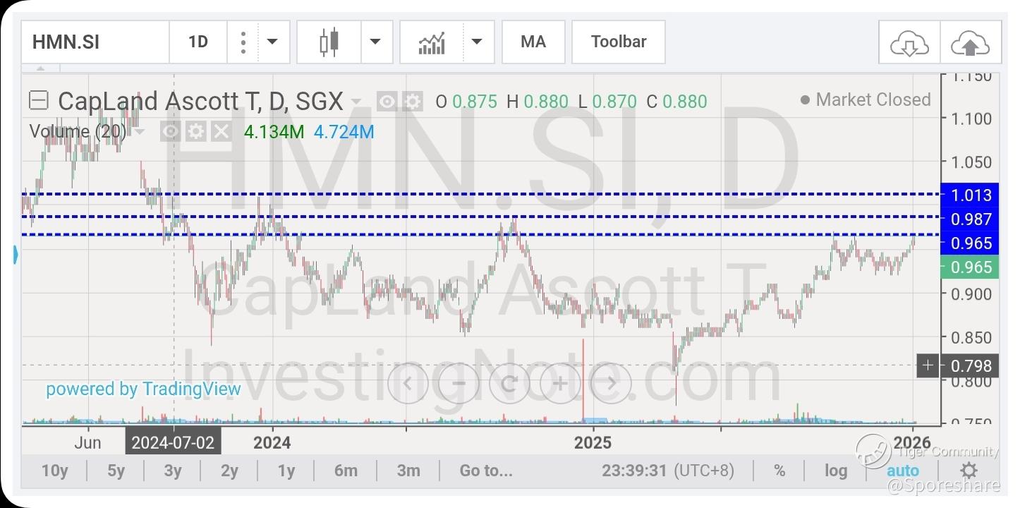 CapLand Ascott Tr - She has risen up nicely and closed well at 96.5 cents likely to continue to trend higher! Full Year results will be out on 29 Jan, dividend is coming, nice!