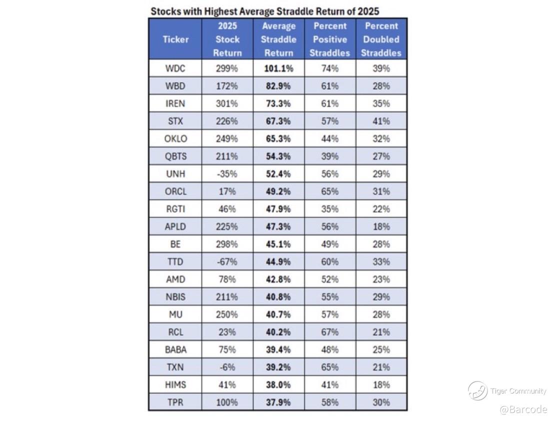 Straddle performance continues to define this regime. Names with the highest average straddle returns in 2025 include WDC, WBD, IREN, STX, OKLO, QBTS, UNH, ORCL, RGTI, APLD, BE, TTD, AMD, NBIS, MU, RCL, BABA, TXN, HIMS, and TPR. Direction matters less than sustained movement, and this environment continues to deliver it.
