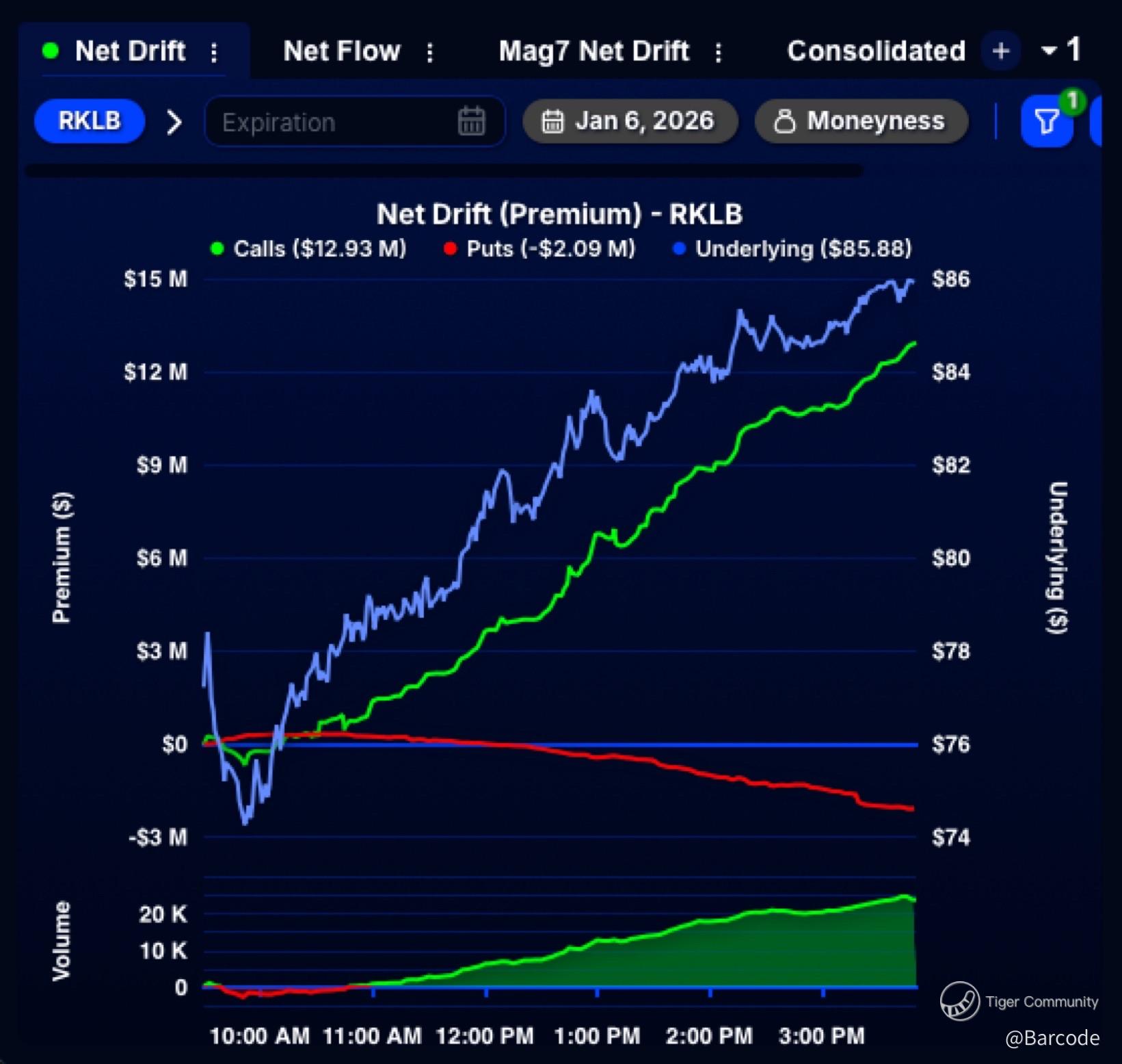 A standout single-name event was Rocket Lab ($RKLB). Over $12M in single-leg calls were bought intraday as the stock jumped $7+ (~9%). RKLB alone accounted for roughly 2% of all unusual options activity excluding the Mag 7. This is textbook dispersion, risk being expressed away from indices into idiosyncratic growth.