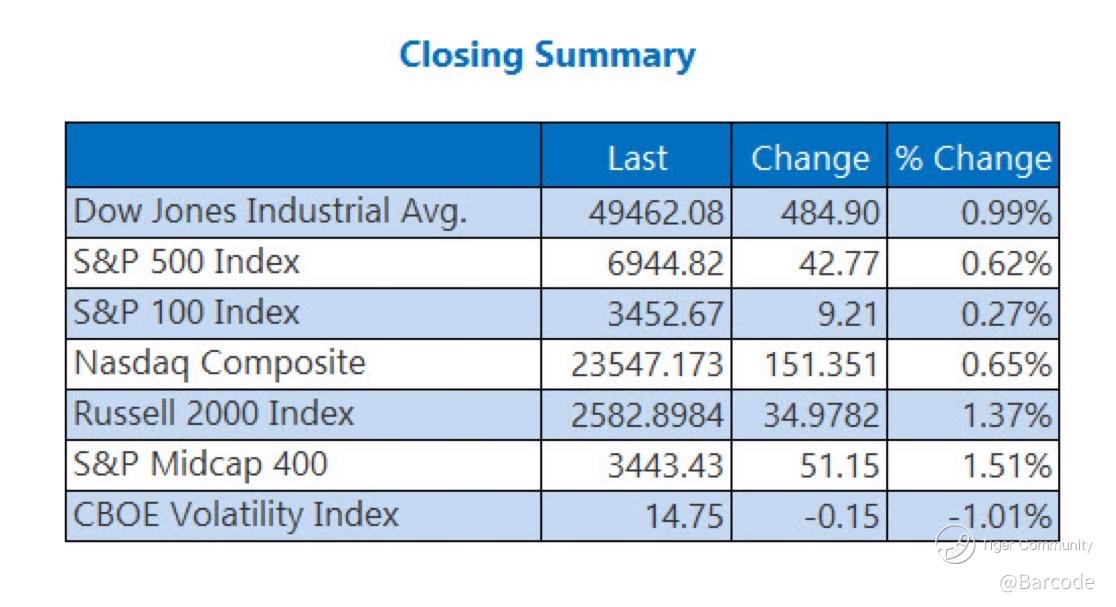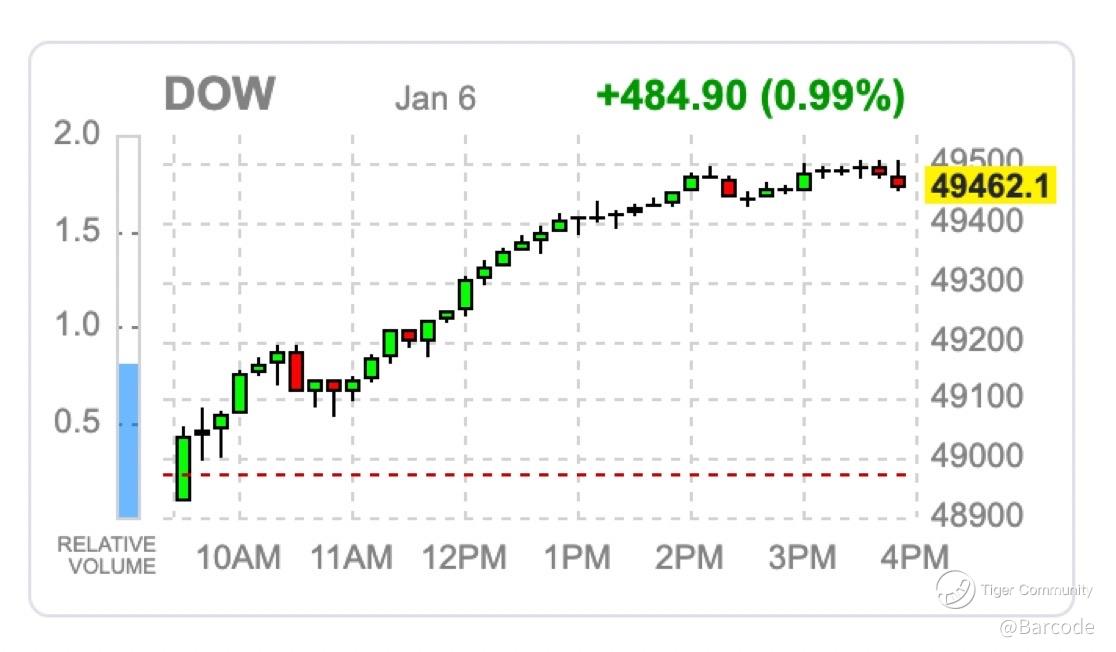 I’m stepping back from the headlines and calling this exactly what it was, a high-quality risk-on session built on structure, not speculation. Price action was confirmed by breadth, volume, gamma positioning, and cross-asset participation, not index optics alone. The Dow closed at 49,462.08, up +484.90 (+0.99%), clearing 49,000 for the first time in history on day three of 2026. The S&P 500 finished at 6,944.82, up +42.77 (+0.62%), another record close. The Nasdaq Composite added +151.35 (+0.65%) to 23,547.17. Leadership dispersion was clear, with the Russell 2000 up +1.37% and the S&P MidCap 400 gaining +1.51%, confirming this move was not megacap-dependent.