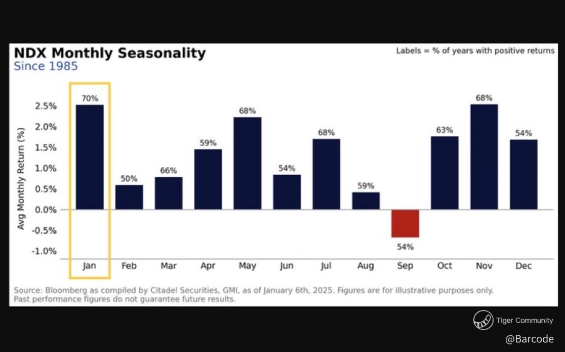 Seasonality helped, but flows did the work. Early-January capital deployment is unfolding as expected, with retirement contributions, year-end bonuses, and discretionary mandates re-entering risk. Historically, the Nasdaq 100 has been positive in January roughly 70% of the time since 1985, and price action so far aligns with that pattern, but with far broader leadership than prior AI-only phases.