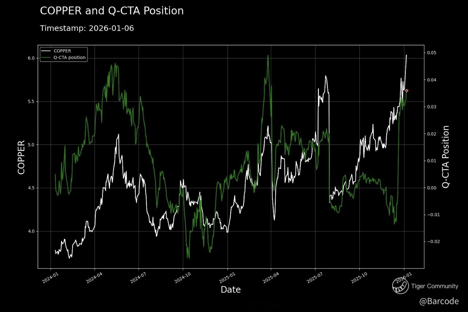 Rotation extended beyond tech. Copper surged as Q-CTA positioning flipped sharply higher again, validating systematic participation. Nickel ripped +9%, its biggest jump in more than three years, driven by Chinese investor demand and supply risks in Indonesia. Despite an oversupplied backdrop, momentum returned decisively, with LME volumes surging during Asian trading hours. This is why materials leadership is real, not speculative. Silver remains firmly in buy-zone, reinforcing commodity breadth without signalling panic inflation hedging.