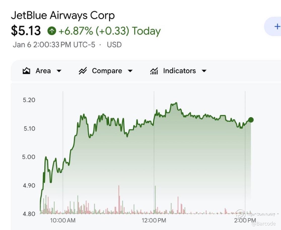 JetBlue also stood out as a clean flow-driven momentum name. $JBLU surged about +7%, pacing its best day since August, with over 53,000 call contracts traded by midday, roughly 4× its 20-day average. This wasn’t random speculation. Momentum built off Monday’s oil-driven bid tied to Venezuela supply optimism, with options activity confirming targeted risk expression rather than passive accumulation.
