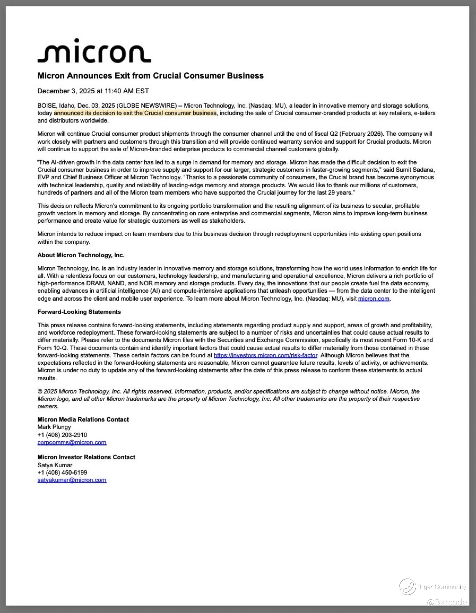 Micron sits at the centre of this shift. On Dec 3, Micron announced it is exiting the Crucial consumer business, including sales through retailers, e-tailers, and distributors worldwide. Consumer shipments will cease after fiscal Q2, ending Feb 2026. The rationale is strategic, not defensive. AI-driven data-centre demand is surging, and Micron is reallocating supply and capital toward higher-margin, faster-growing enterprise customers. As Sumit Sadana stated, AI-driven growth in the data centre has forced difficult supply decisions to better support larger strategic customers.