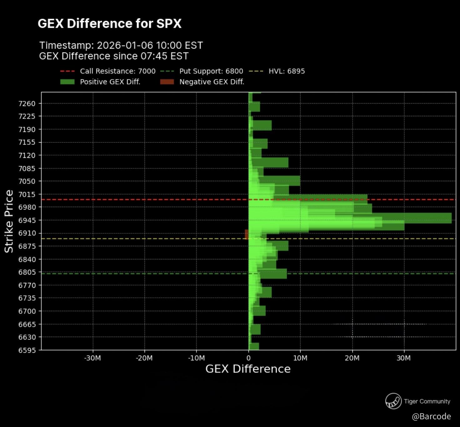 Intraday structure stayed clean from open to close. Indices absorbed liquidity pockets above prior resistance and closed near the highs without meaningful retracement. The key mechanical driver was massive positive GEX in SPX, which dampened pullbacks and reinforced upside continuation once resistance was cleared. Dealer hedging stayed supportive, volatility was sold into strength, and the tape reflected classic positive-gamma behaviour.