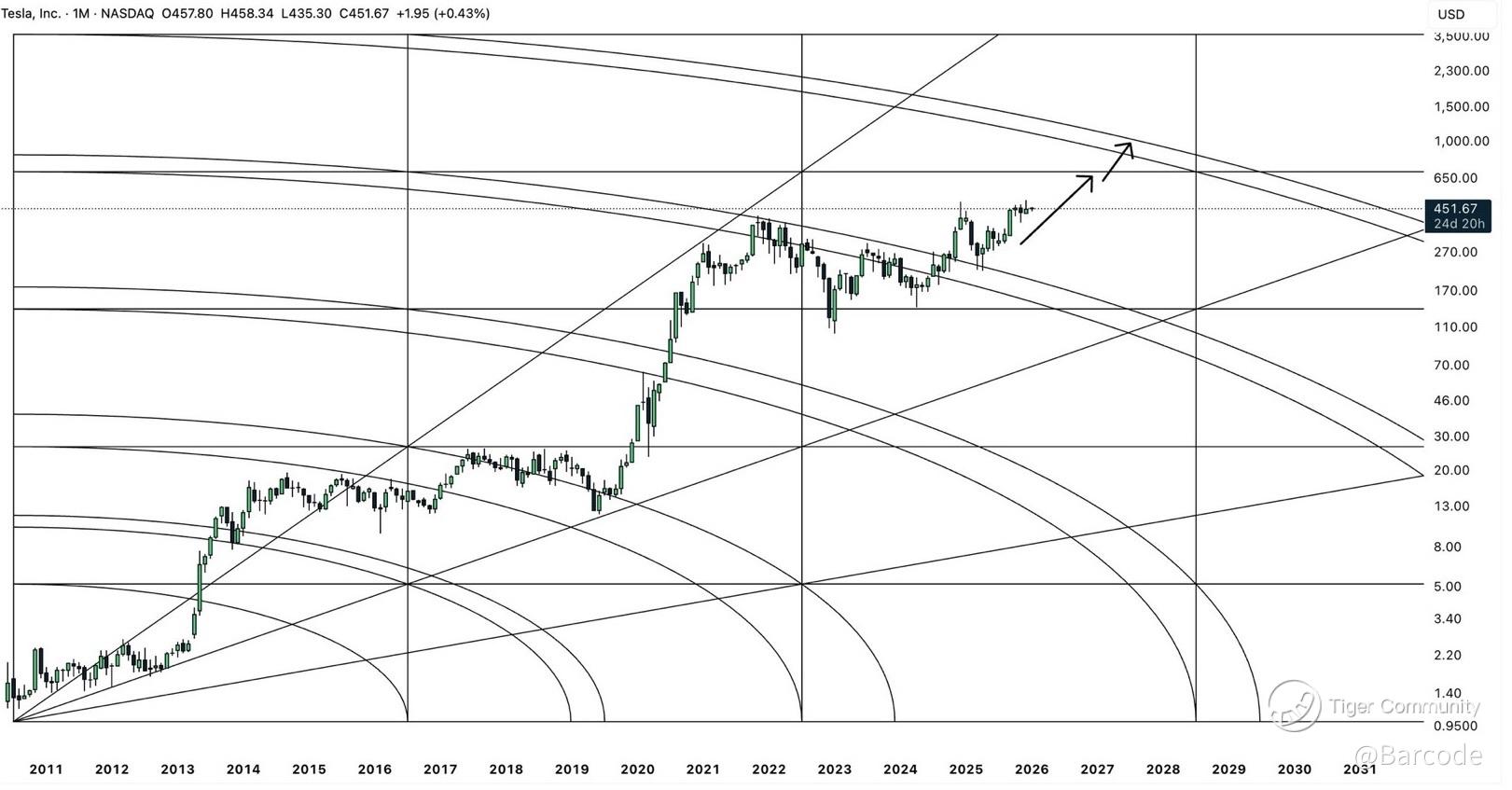 According to this 15-year Gann framework, Tesla remains in a zone that historically resolves through time expansion rather than trend failure. That’s where the $700–$1,000 projections originate, not from narrative enthusiasm, but from time symmetry and price geometry.