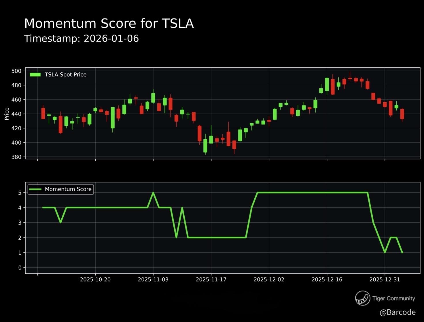 Tesla’s momentum score has dropped to 1, confirming sharp deterioration in short-term sentiment. I take that seriously. But these readings matter most at structural decision points, not in isolation.