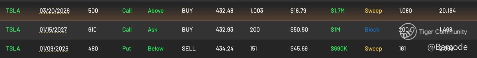 While price targets scream collapse, someone just committed ~$1.7M to $TSLA 500 strike calls with spot near ~$437. Alongside that are longer-dated call blocks and sweeps extending into 2026 and 2027.