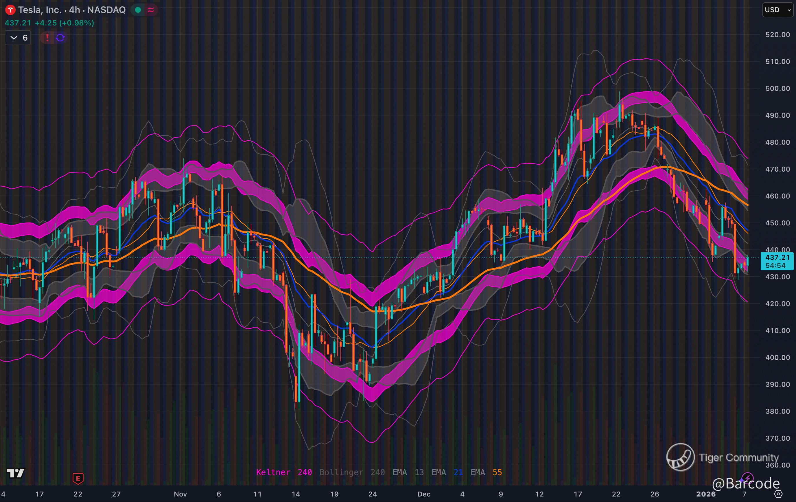 On the 4H chart, price has pulled back into the $430–440 zone, where prior demand, moving averages, and compressed Keltner and Bollinger bands converge. This is not free-fall territory. This is where continuation and failure separate. Volume contraction on the downside signals digestion, not liquidation.