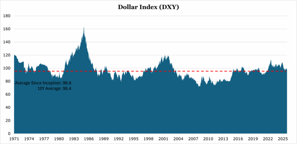 Historically though, the DXY is still elevated, and the 2025 decline of the USD brings it more close in line to where it has historically traded.
