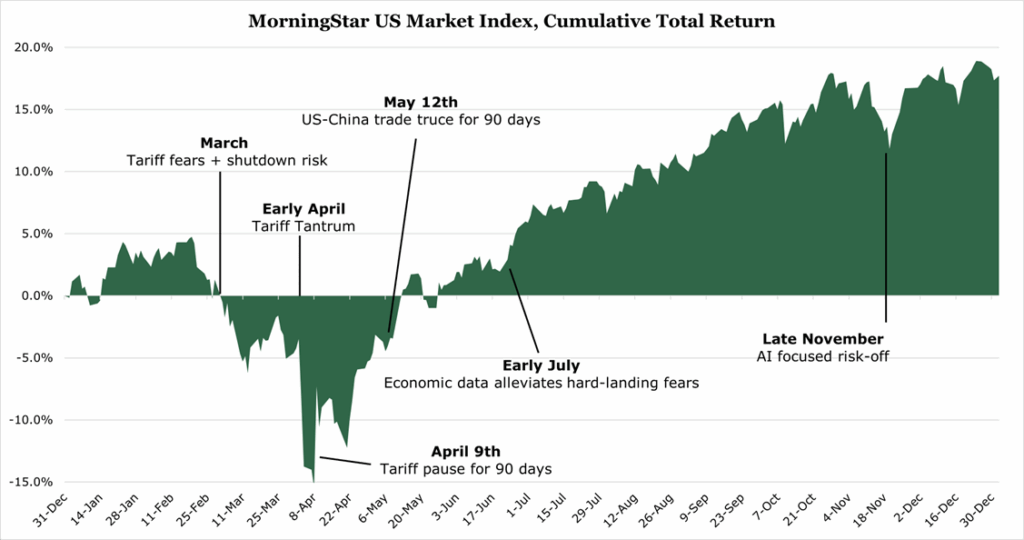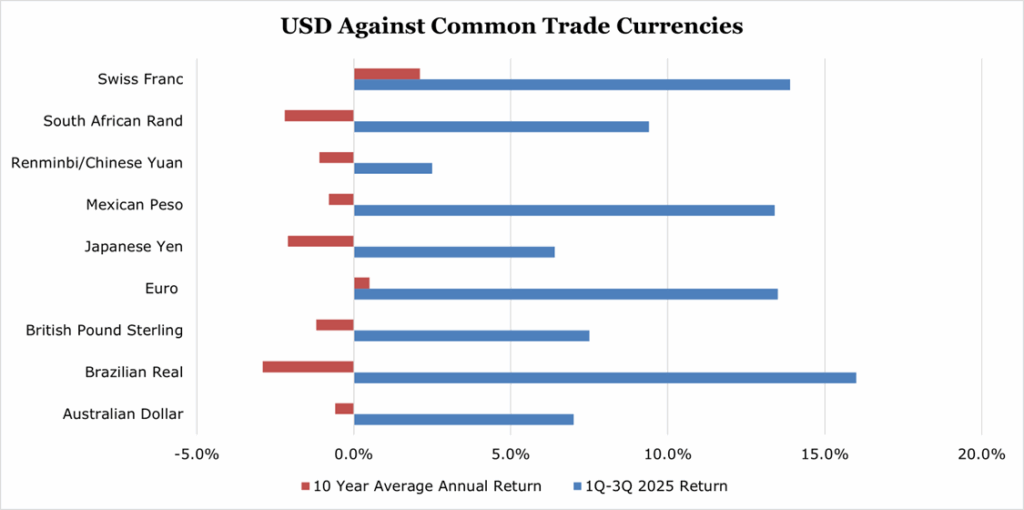 The DXY which measures the dollars value against a basket of currencies, declined 9.23% during 2025. The selloff was largely driven by long-standing concerns, such as continued deficit spending, amplified by shorter term concerns such as Fed independence and tariff policy.
