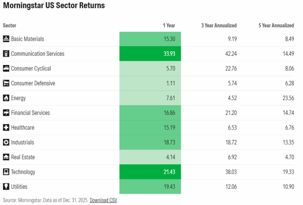 Nearly 60% of equity market gains have come from communications and tech. Though, not all were winners. Morningstar notes that companies focused heavily on software actually detracted 1.0% from the market during 2025. Despite a shaky macroeconomic background, the consumer defensive sector rose just 1.11%.