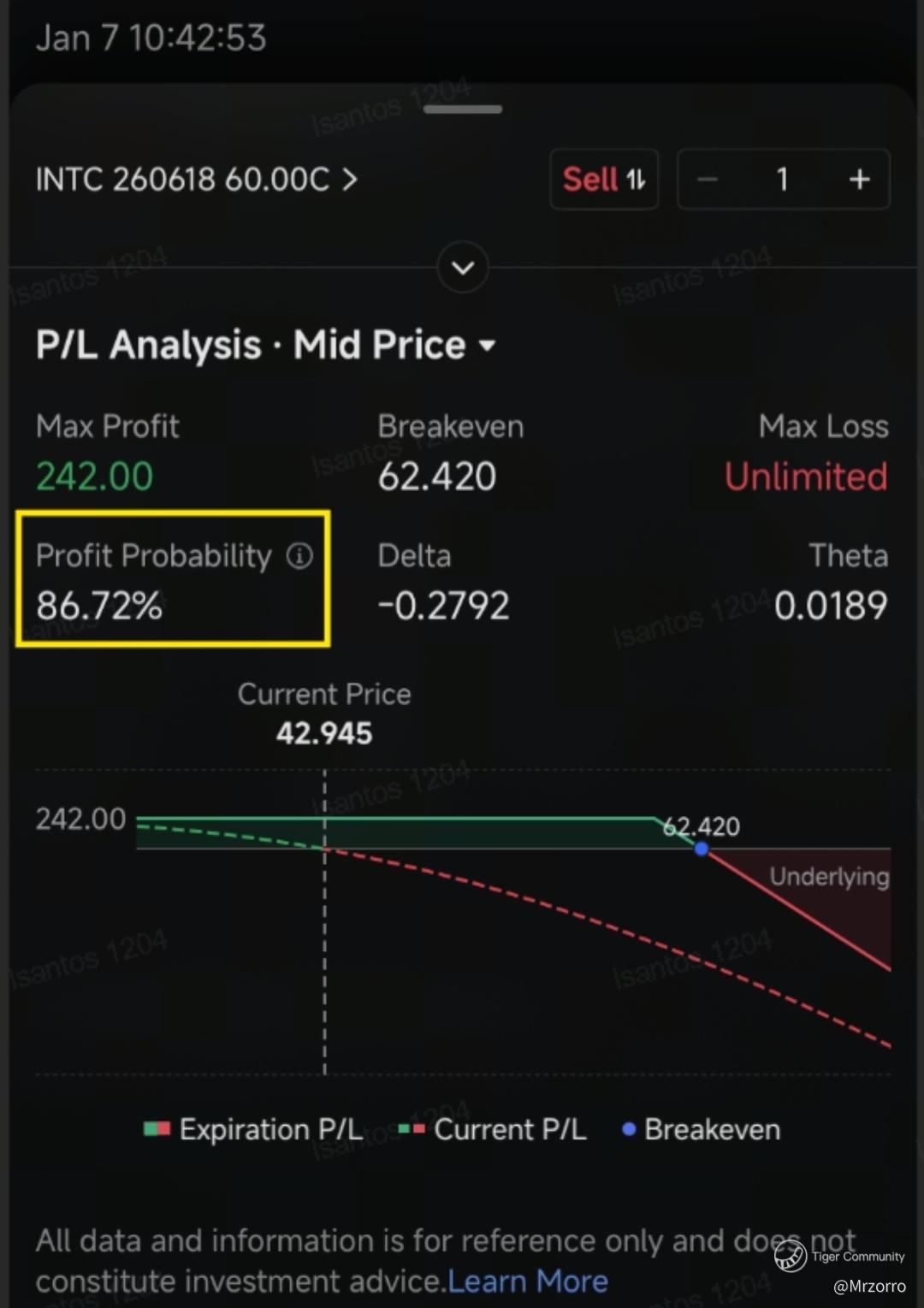 While the purchase of $48 call options just has a 24% profit probability at current prices, the other side of the trade– the sale of the $60 call options – has better odds, 87% profit probability.