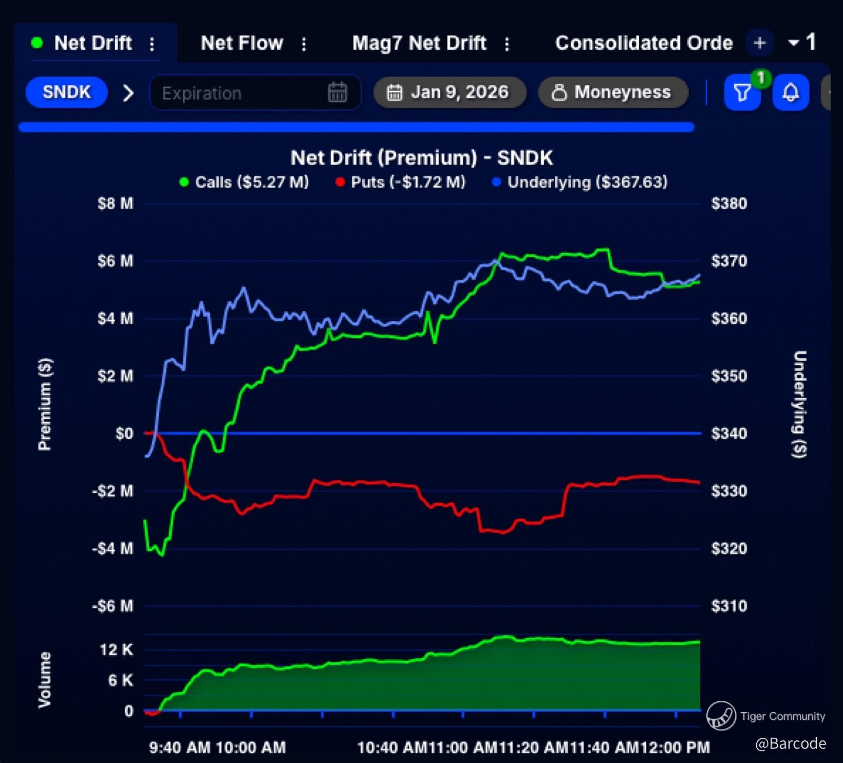 🟩 $SNDK leads the market in unusual options activity today with over $5M+ in single leg call buying. Shares are up $32+ or 9.8% intraday as aggressive bullish flow hits the tape.
