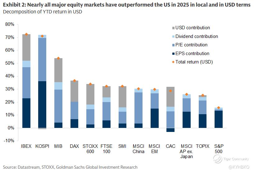 Markets are quietly shifting. All major equity markets have outperformed the US in 2025 by an average of ~20%. Even with the help of the AI bubble, the S&P 500 is struggling to keep up. History matters here. Historically, every time the S&P reached today’s P/E levels, the following decade delivered near-zero returns. We’re watching the opening chapter unfold in real time. - X user Lukas Ekwueme