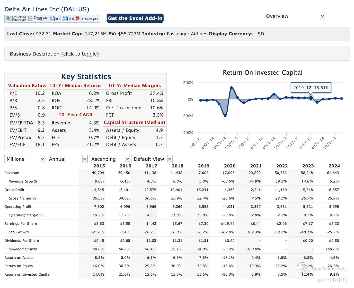 Delta Air Lines has demonstrated substantial growth and resilience over the past ten years. The company’s revenue increased from $40.7 billion in 2015 to $61.6 billion in 2024. Notably, Delta managed to recover from the significant downturn caused by the COVID-19 pandemic, which saw the annual revenue drop to $19 billion in 2020.