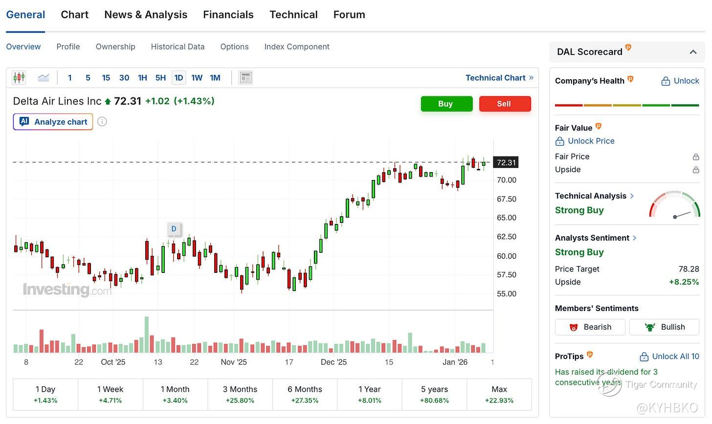 Focusing on Delta Air Lines, technical analysts have issued a “strong buy” recommendation for the stock. This aligns with broader analyst sentiment, as the current price target stands at $78.28, indicating a potential upside of 8.25%. Over the past year, Delta’s stock price has increased by 9.3%.