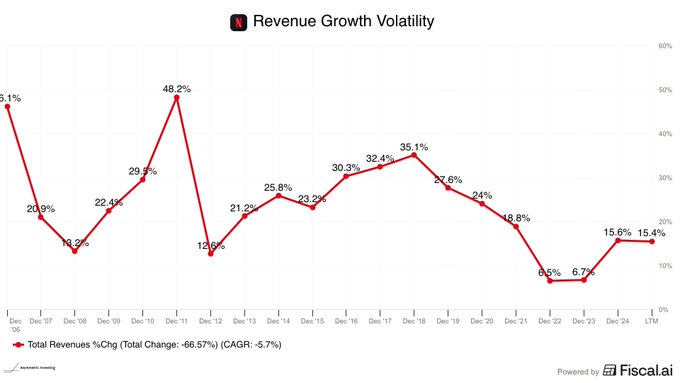 This is Netflix's revenue growth rate over 20 years. It was a wild roller coaster!