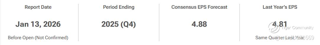$JPMorgan Chase(JPM)$ is scheduled to report its fiscal Q4 2025 earnings on Tuesday, January 13, 2026, before the market opens.