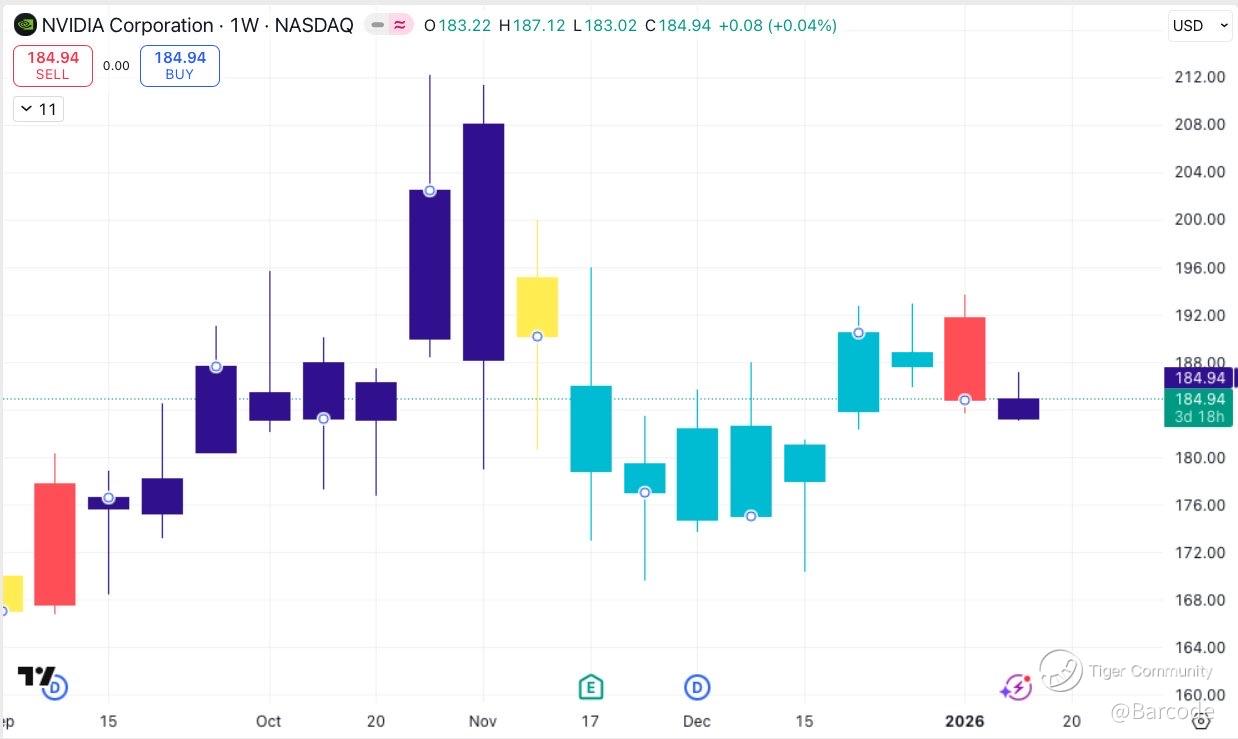 $NVDA is locked in a multi-week compression between $180 and $190, holding above the rising 50-week and the $160.85 institutional liquidity shelf. The weekly momentum model just flipped red for the first time since September, the same regime that preceded the October vertical into $210+. With the same signal now active in January, the probability skew tilts toward a return into the $200 handle.