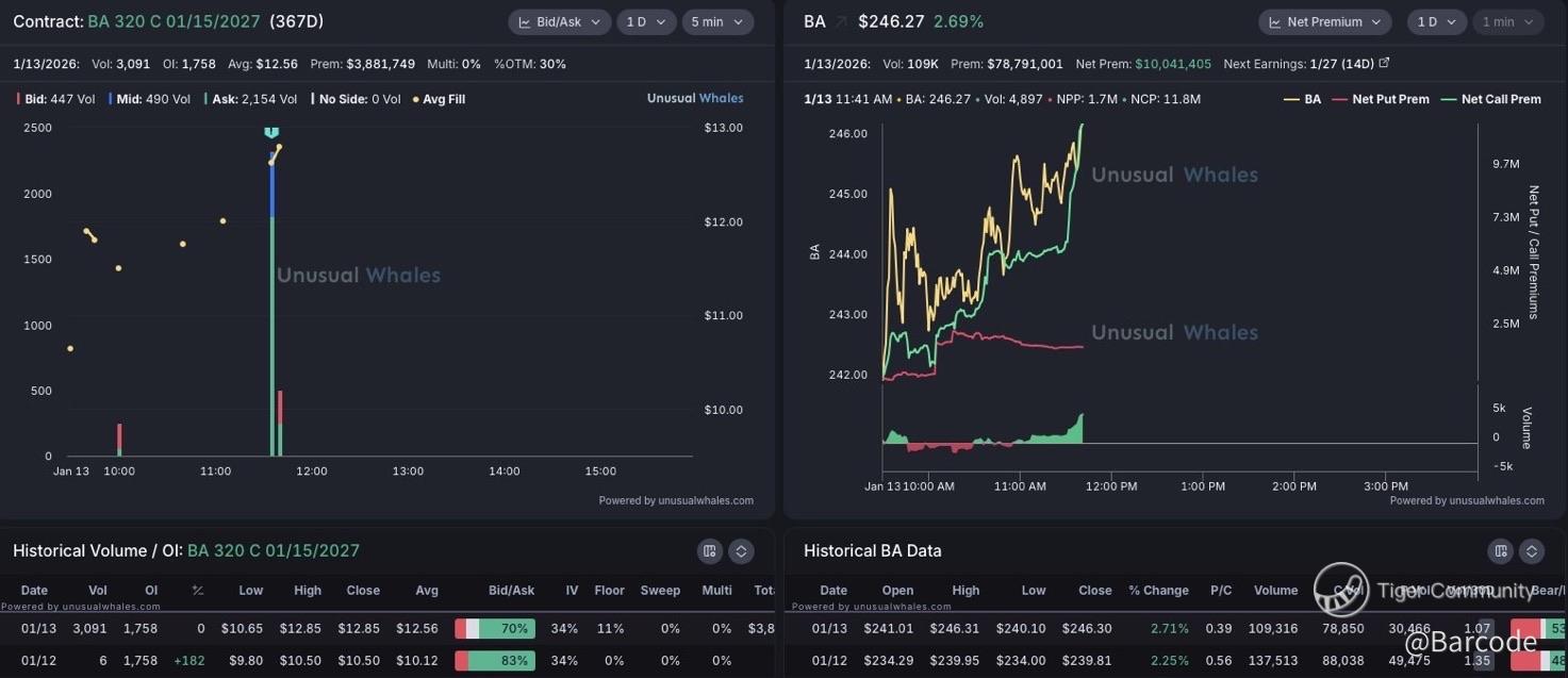 🚨 $3.8M in long-dated call premium just hit the tape on $BA 320C 15Jan2027, a deep-OTM, multi-year convexity trade expressing bullish delta, gamma and vanna exposure into a full Boeing recovery cycle. This is dealer-hedging sensitive flow. As spot rises, market makers must buy stock, reinforcing upside momentum through positive gamma feedback loops.