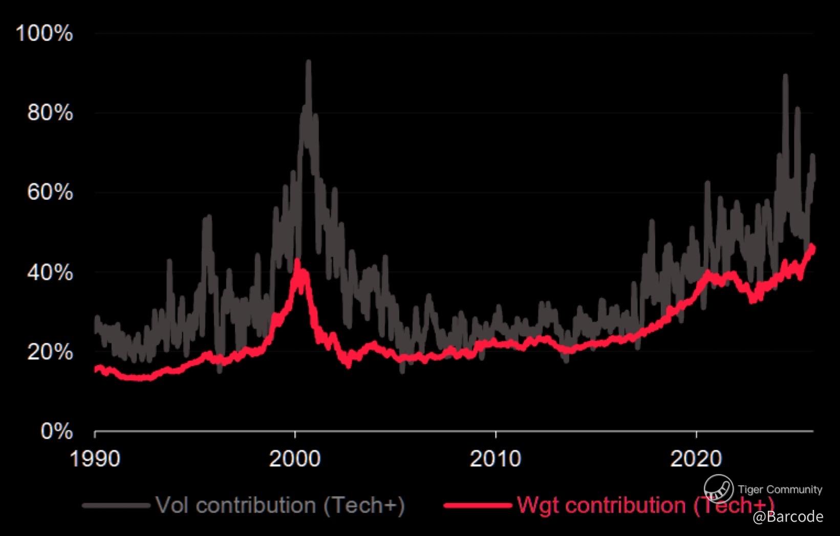 SocGen notes that the Tech+ complex is now contributing roughly 60โ80% of $SPX volatility. That level of concentration explains why index calm can coexist with violent single-name and sector moves.