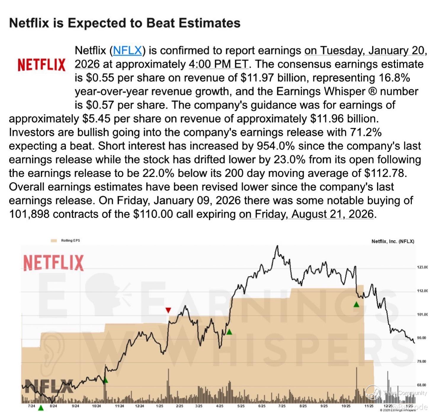 $NFLX is expected to beat estimates. Consensus sits below the Earnings Whisper, positioning is skewed bullish, and options flow has leaned into longer-dated upside. Short interest has risen materially, increasing reflexivity around the print.