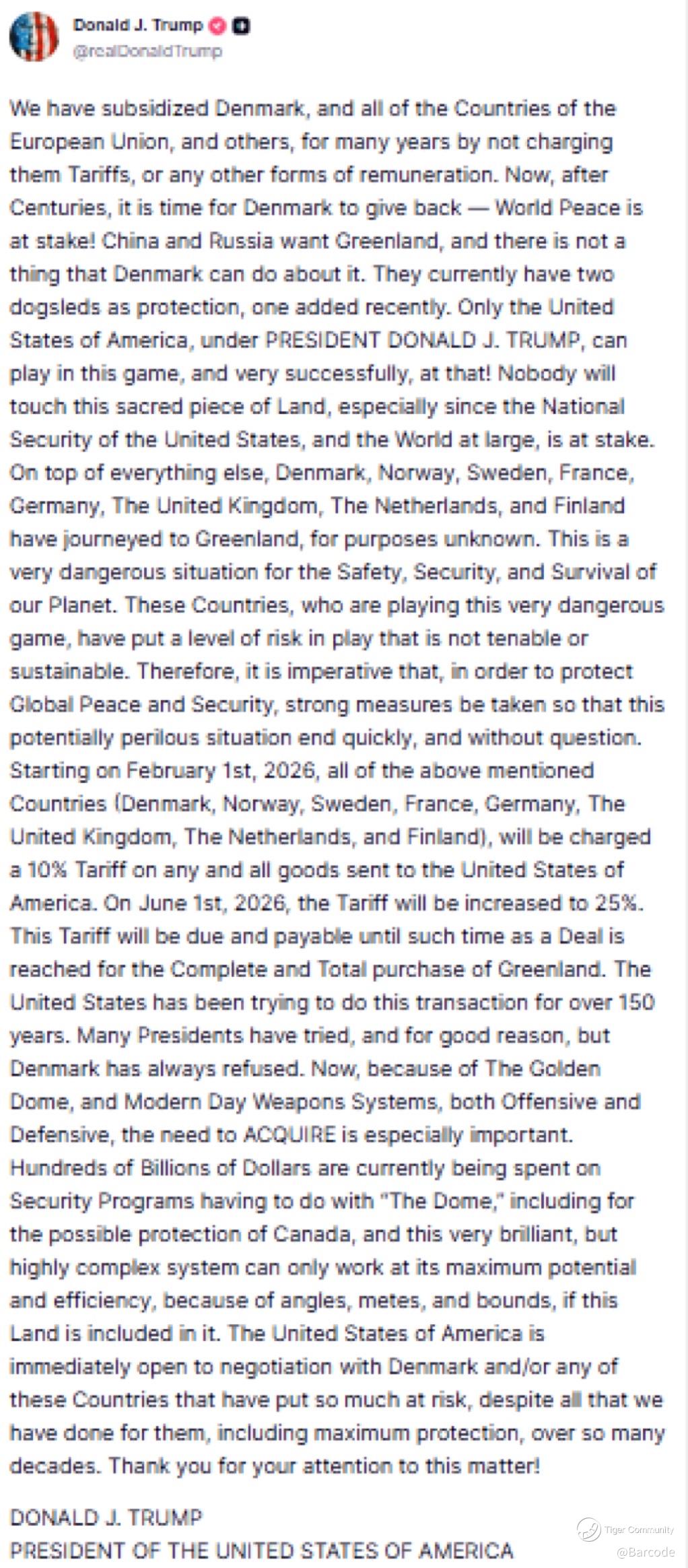 Tariffs of 10% on eight countries begin 01Feb26, escalating to 25% on 01Jun26 unless a deal is reached. NATO remains intact, but the framing has shifted decisively. Greenland is now being positioned explicitly as a US national security asset, with China and Russia named as strategic threats.