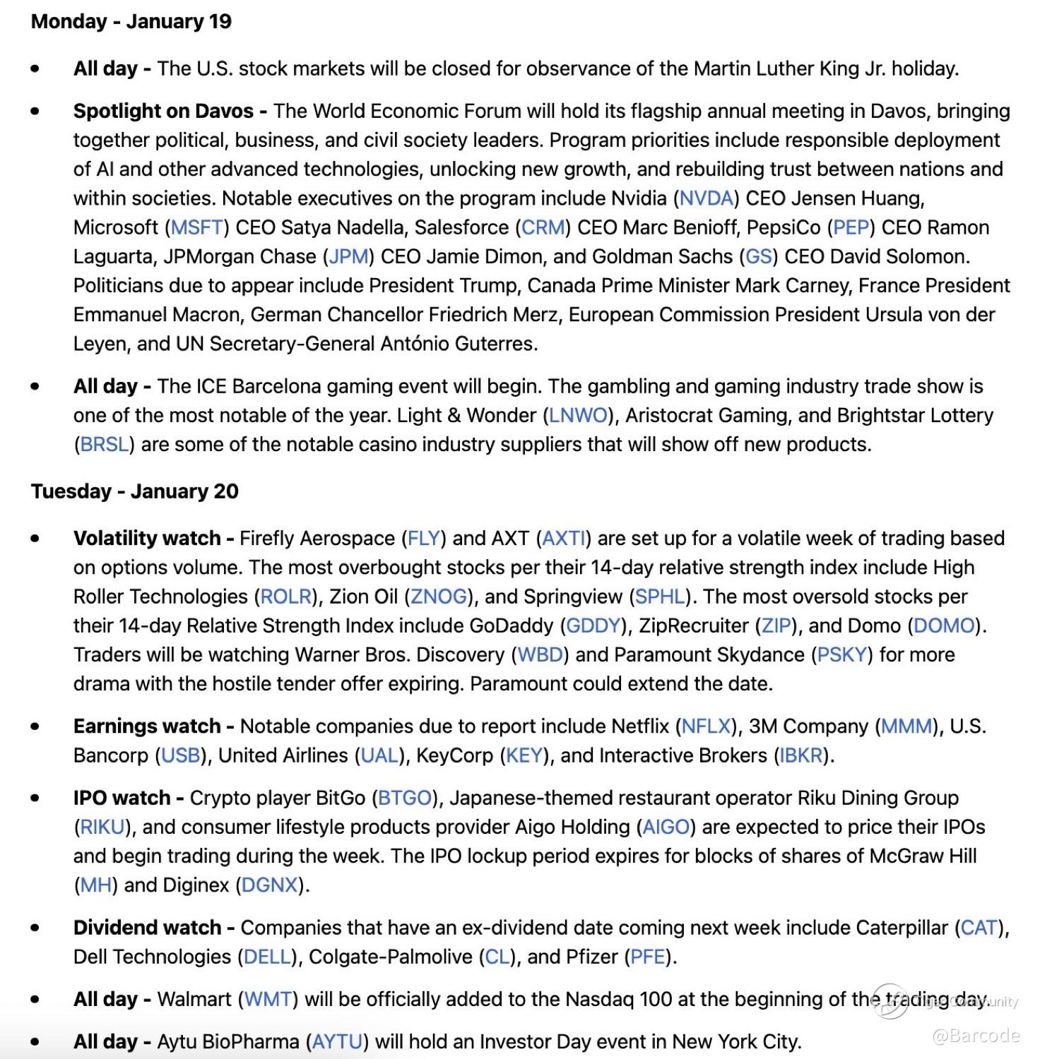 You should expect a steady flow of major CEOs and global policymakers on CNBC and Bloomberg throughout the week, often reacting in real time to geopolitics, trade, and policy narratives rather than prepared remarks.