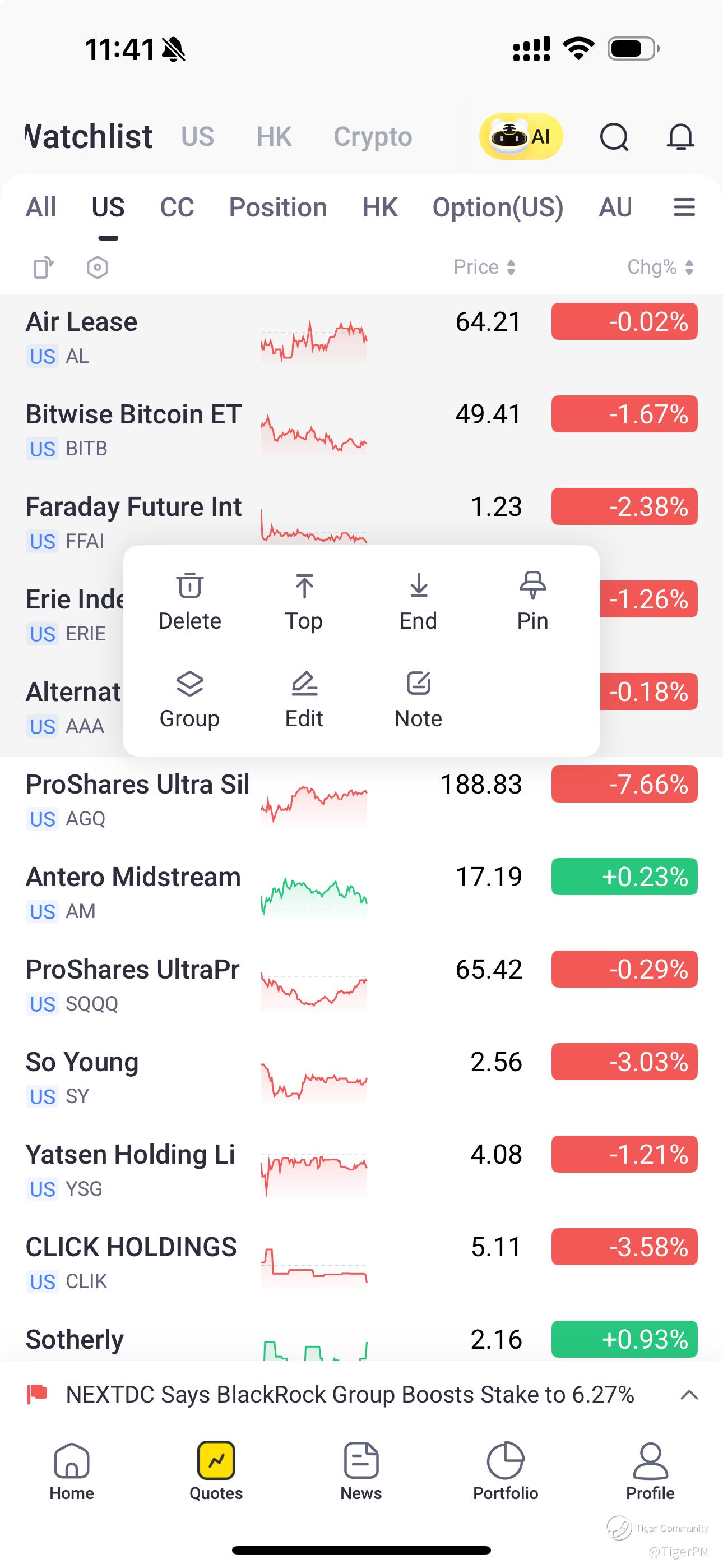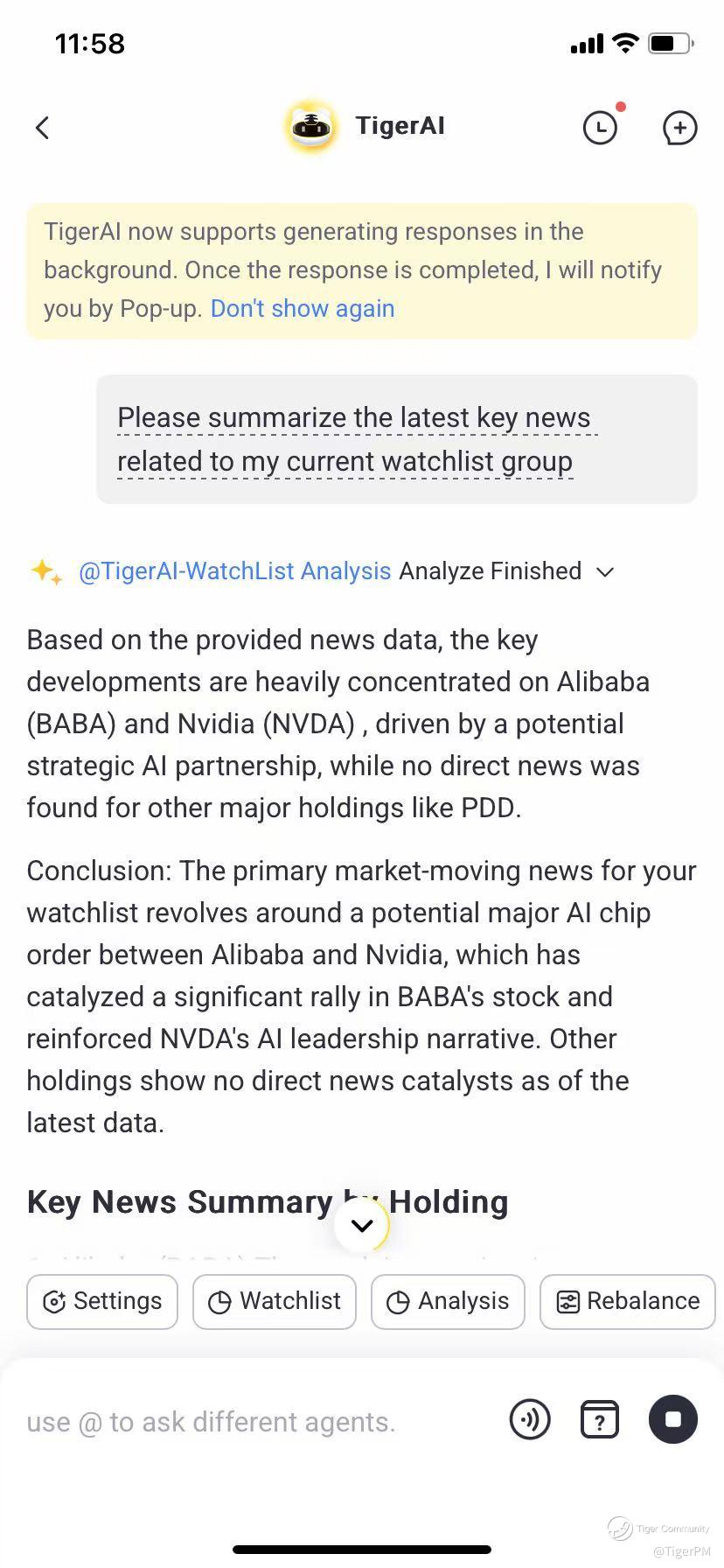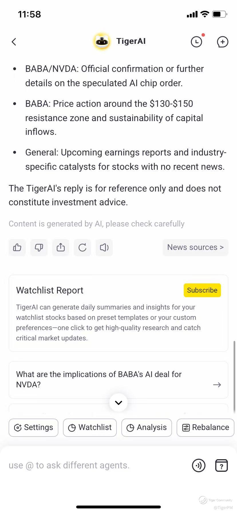 TigerAI newly added Watchlist Analysis Agent and Daily Report Subscription feature. You can now access insights related to your watchlist (e.g. Daily highlight news, Earnings report, etc.) in TigerAI by using recommended questions or asking by yourself.