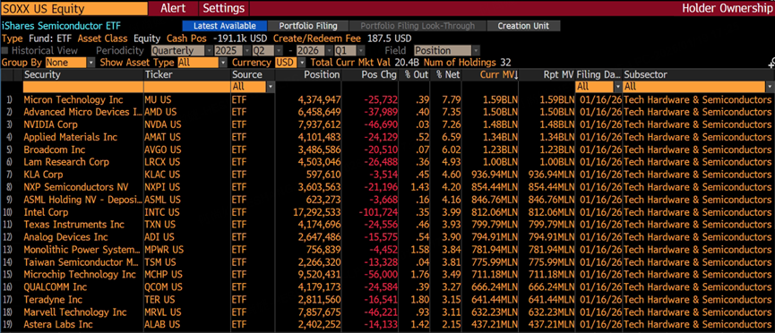 $iShares Semiconductor ETF(SOXX)$ : In terms of scale, Soxx ranks second only to SMH, with a management fee rate that is also comparable. However, looking at its holdings structure, Soxx holds only 3.8% of TSMC. On the positive side, SOXX’s holdings are more evenly distributed. Its largest position is Micron Technology, accounting for 7.8% of net asset value, unlike SMH, where NVIDIA alone makes up close to 19% of the portfolio.