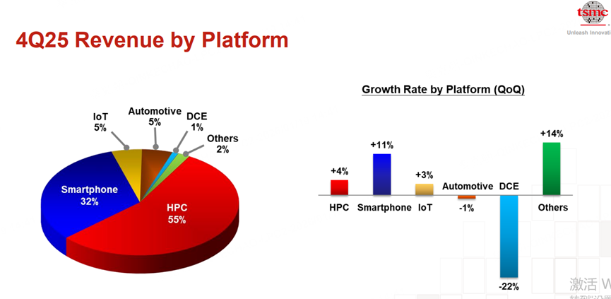 By platform, high-performance computing (including GPUs) contributed 55% of revenue, smartphones contributed 32%, while IoT and autonomous driving generated lower revenue. Within this breakdown, high-performance computing grew 4% quarter-over-quarter, while smartphones grew 11% quarter-over-quarter.