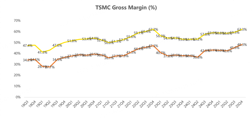 On profitability, TSMC’s Q4 gross margin reached 62.3%, setting a new historical record and coming in well above the consensus estimate of 60.6%. This was mainly driven by higher capacity utilization, depreciation of the New Taiwan dollar, and effective cost control.