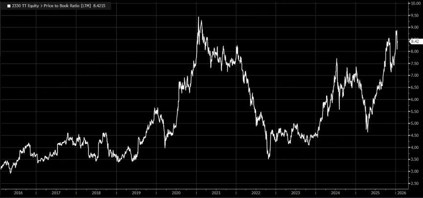 In terms of valuation, TSMC's price-to-book ratio stands at 8.4 times, below the 9.5 times seen at the peak of the semiconductor bull market in 2021: