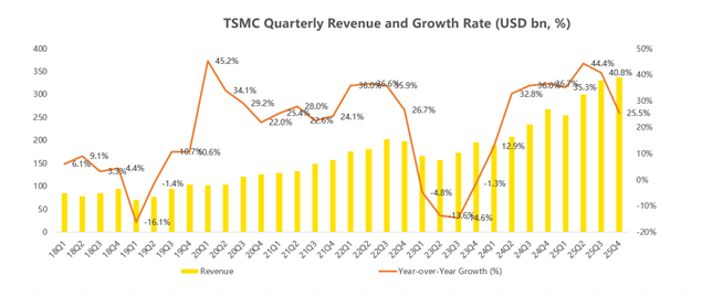Second, in terms of revenue, TSMC's fourth-quarter revenue reached $33.7 billion, marking a 25.5% year-over-year increase! Since the company disclosed its December revenue figures on January 10, the fourth-quarter revenue is now fully disclosed: