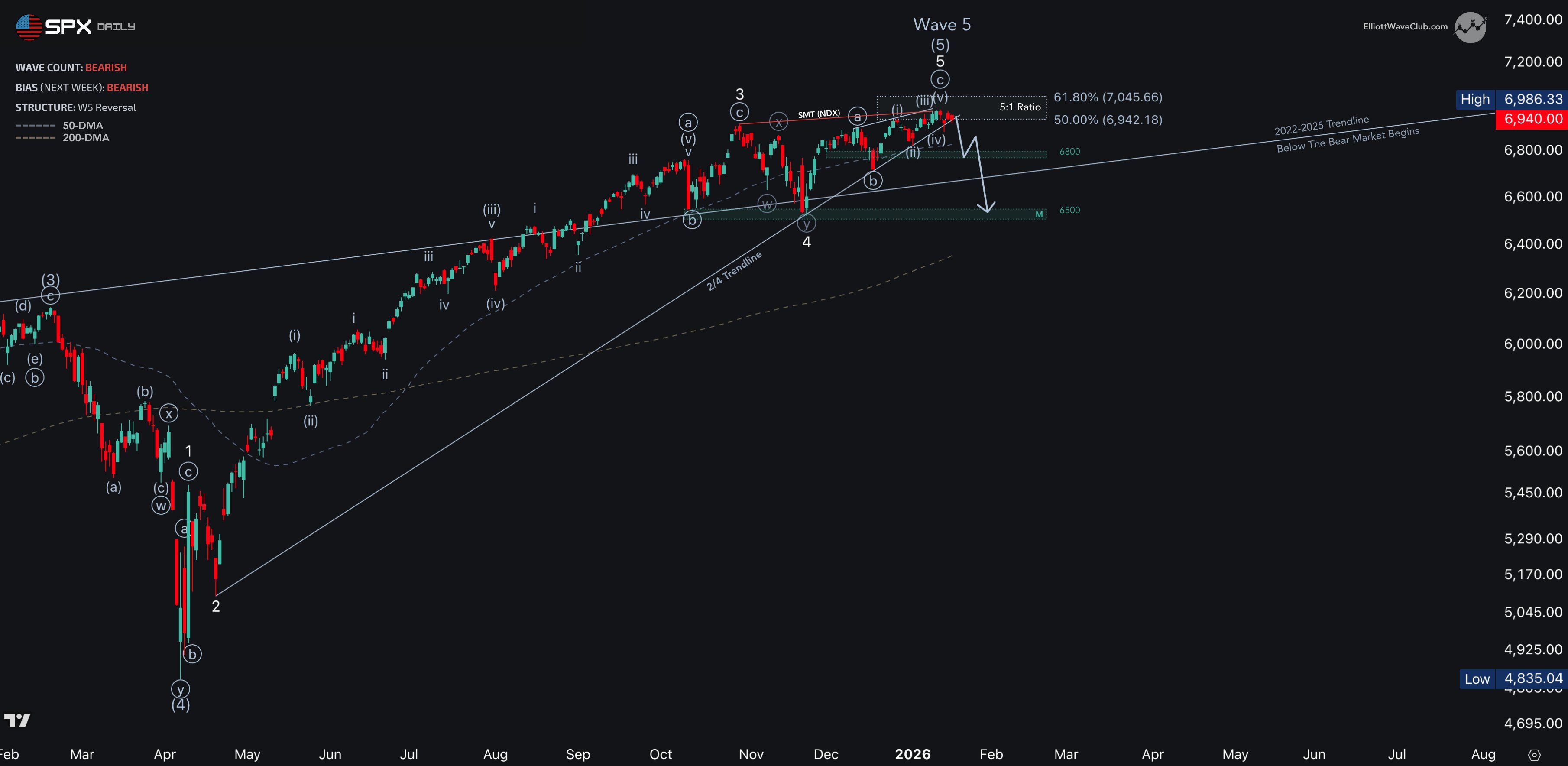 From there, the setup targets a final grind toward 7000–7050 for Wave 5.