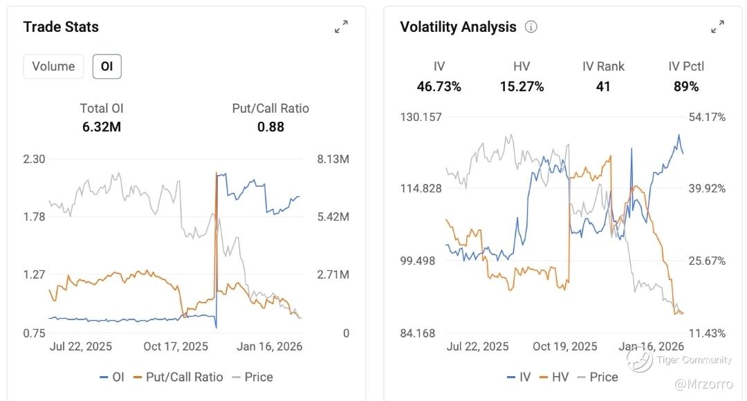 The current put/call ratio is 0.88, suggesting sentiment is slightly bullish. Implied volatility is around 46%, which sits in the mid-range based on IV rank. If you expect the post-earnings move to exceed 7.2%, you may consider positioning as an options buyer.