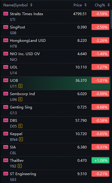 Singapore stocks opened lower on Wednesday. STI down 0.6%; SingPost down 2.5%; NIO fell 1.5%; UOL, UOB down 1%.