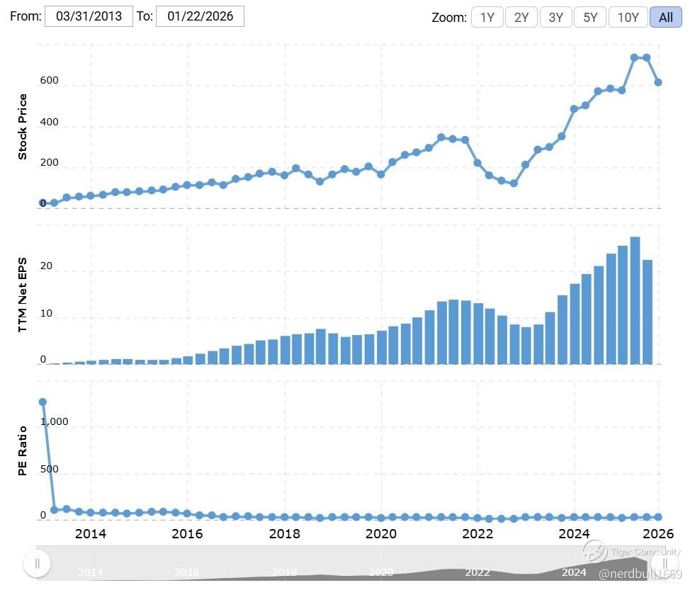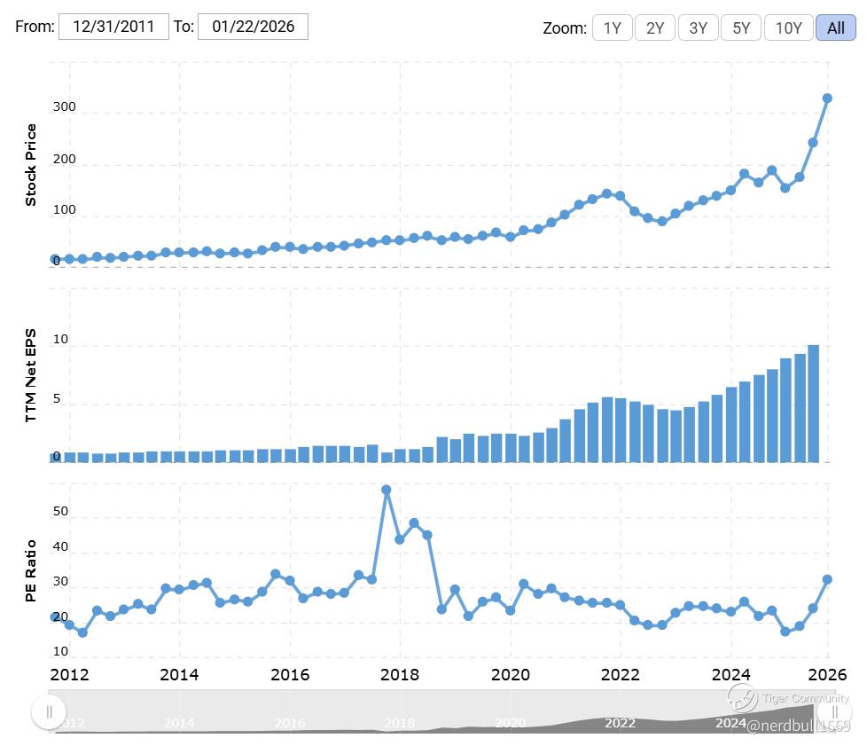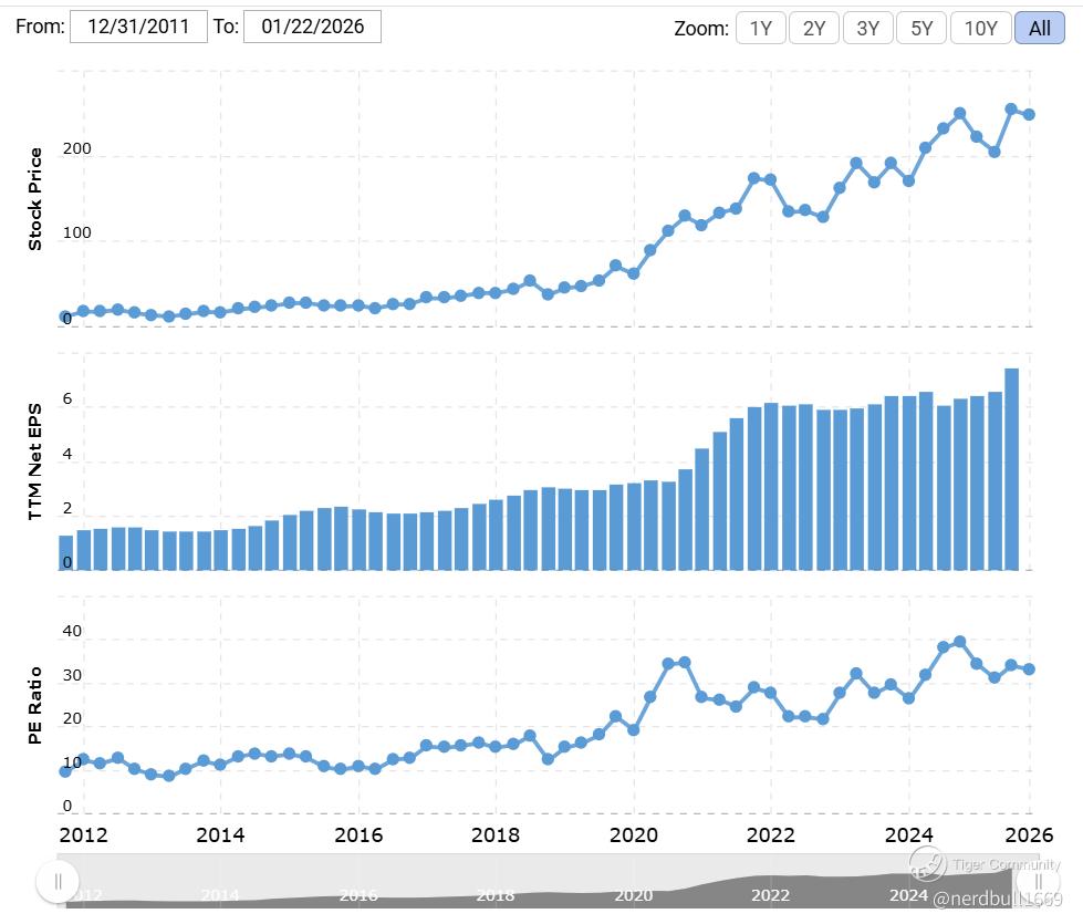 Forward P/E ~30–32×, consistent with long-term growth expectations.