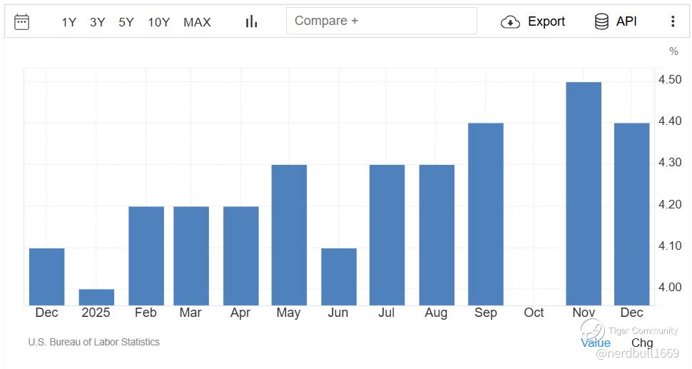 The US unemployment rate edged down to 4.4% in December 2025, from a revised 4.5% in November, which had marked the highest level since October 2021. The reading also came in slightly below market expectations of 4.5%. The number of unemployed fell by 278,000 to 7.50 million, while employment increased by 232,000 to 163.99 million.