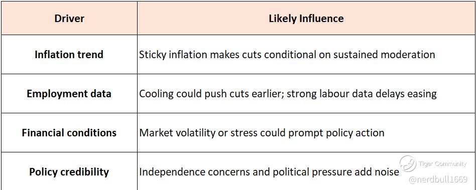Late 2026: Final timing and depth of easing will depend on labour market trends, inflation consistency, and financial conditions. If growth unexpectedly accelerates or inflation resurges, easing could be delayed or scaled back.