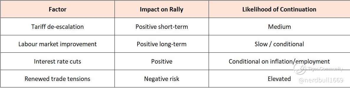 Conclusion: The recent rally is real but fragile. It is driven mainly by uncertainty reduction rather than immediate improvements in core economic data. For employment data and interest rate decisions to improve sustainably, underlying economic fundamentals must strengthen beyond tariff rhetoric.