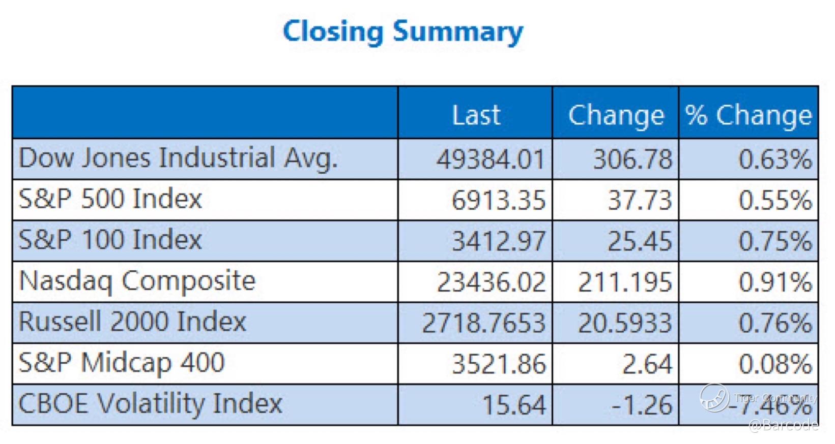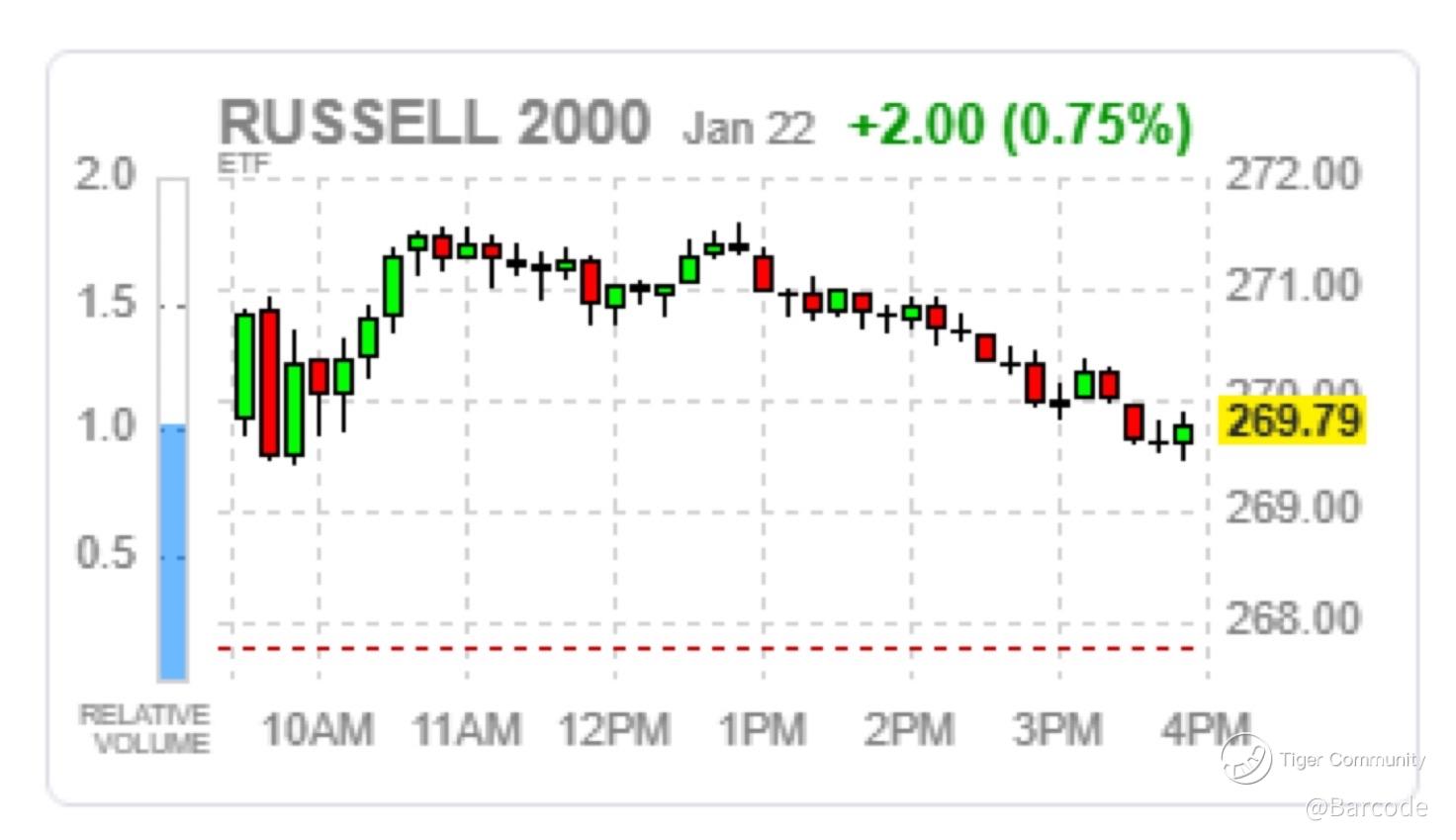 US equities extended gains after Trump backed away from immediate European tariffs and signalled a NATO backed framework tied to Greenland, reducing headline risk even as Denmark reiterated sovereignty constraints. The Dow Jones Industrial Average $DJI climbed +285 points to erase weekly losses, closing near 49,384. The S&P 500 $SPX advanced toward 6,913, with $SPY tracking higher alongside index strength. The Nasdaq Composite $COMP outperformed near 23,436, with $QQQ leading large cap growth momentum. The Russell 2000 $RUT closed at its 8th all time high of the year and is now in its longest winning streak in nearly 30 years, confirming small cap leadership through operating leverage and reinforcing a sustained breadth thrust.