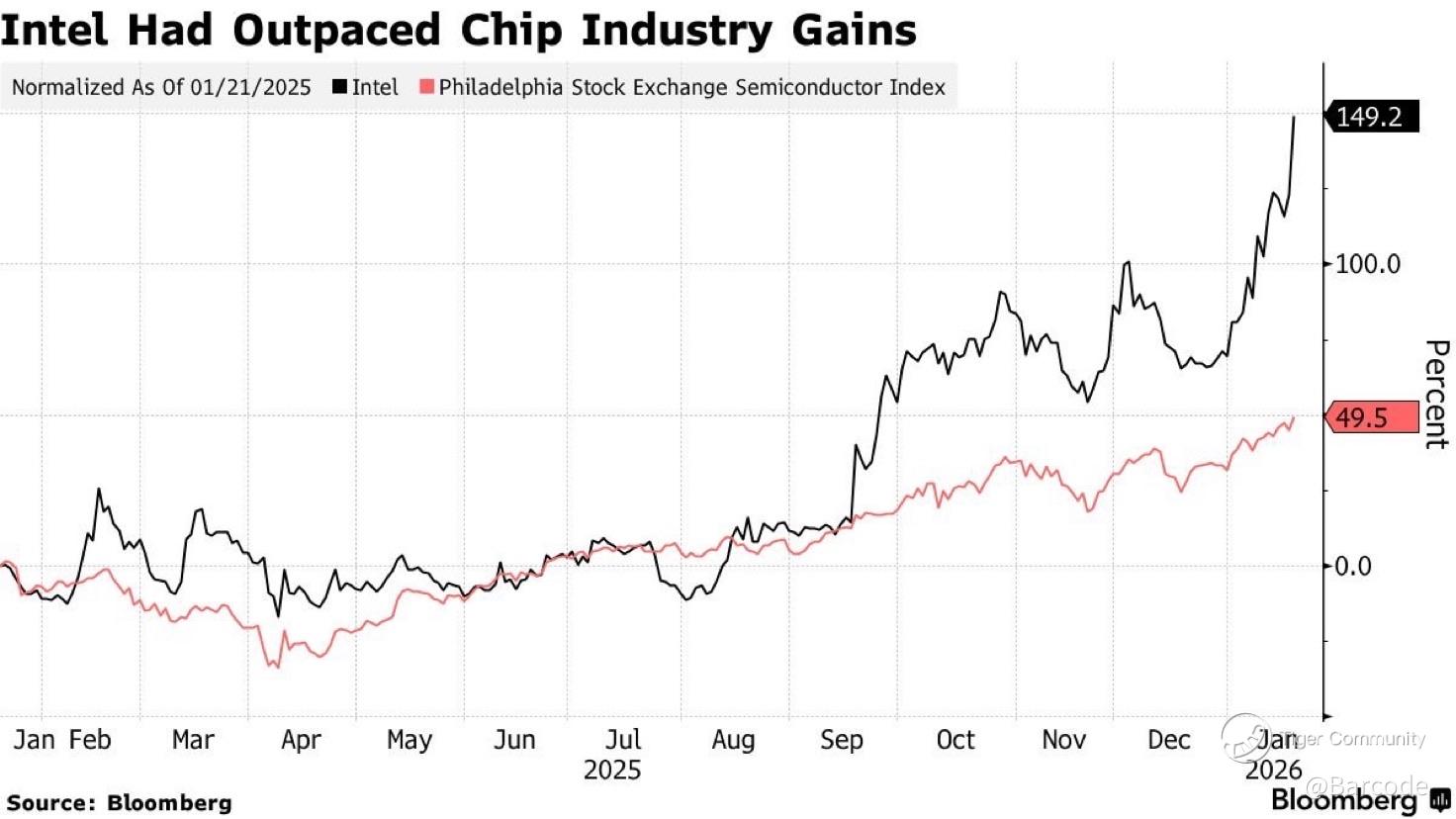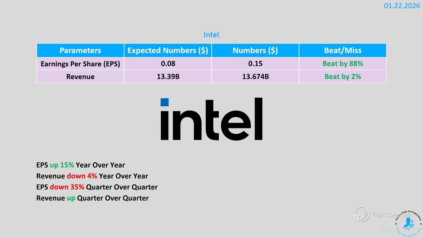 🟡 $INTC Intel beat Q4 expectations but guided soft for Q1, projecting revenue of $11.7B to $12.7B versus $12.6B consensus, with adjusted EPS guided to breakeven versus $0.06 expected. Management acknowledged chip yield issues, inventory constraints, and supply shortages expected to peak in Q1 before improving later in the year. After hours trading saw $INTC drop sharply, underscoring execution risk and potential pressure on broader semiconductor multiples. I’m convinced Intel’s relative outperformance versus the broader chip industry is nearing an inflection point as AI capex optimism collides with operational reality.